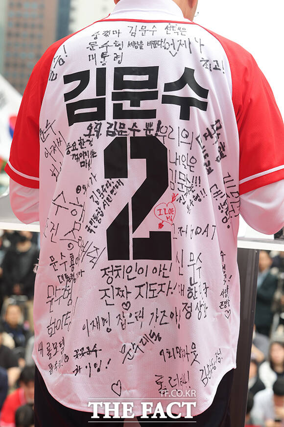 [더팩트ㅣ임영무 기자] 김문수 국민의힘 대선 후보가 19일 오전 서울 중구 청계광장 소라탑 앞에서 '청년이 바라는 대한민국' 정책 공약 발표를 하고 있다. 김 후보 유세복에는 응원 문구가 쓰여 있다.darkroom@tf.co.kr사진영상기획부 photo@tf.co.kr