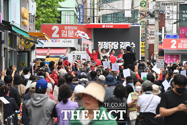 [더팩트ㅣ임영무 기자] 김문수 국민의힘 대선 후보가 20일 오후 서울 강서구 남부골목시장 입구를 찾아 시민들의 지지를 호소하고 있다.