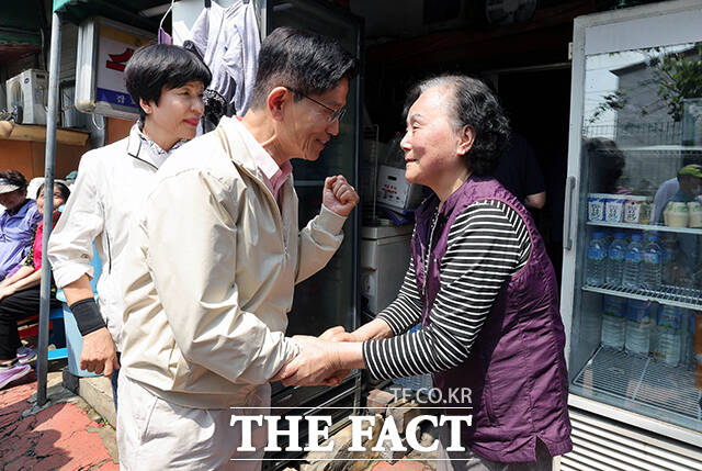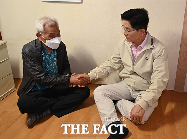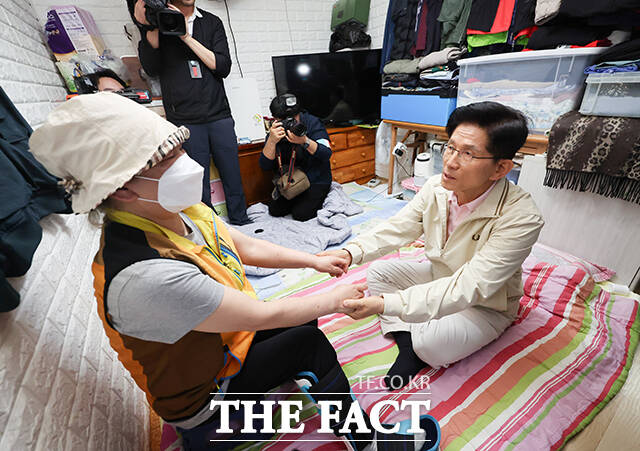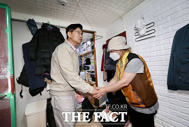 [더팩트ㅣ임영무 기자] 김문수 국민의힘 대선 후보가 20일 서울 영등포 쪽방촌을 방문해 한 어르신과 이야기를 나누고 있다.