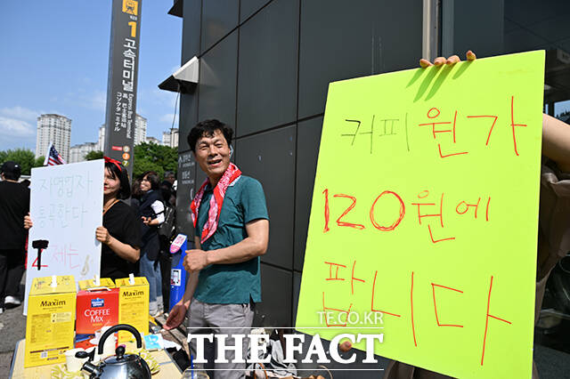 [더팩트ㅣ임영무 기자] 김문수 국민의힘 대선후보가 20일 서울 서초구 고속터미널역 앞 광장에서 유세를 펼친 가운데 자영업자들이 커피를 120원에 판매하고 있다.