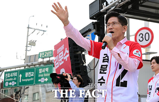 [더팩트ㅣ임영무 기자] 김문수 국민의힘 대선 후보가 20일 오후 서울 강동구 광진교 남단사거리를 찾아 시민들의 지지를 호소하고 있다.