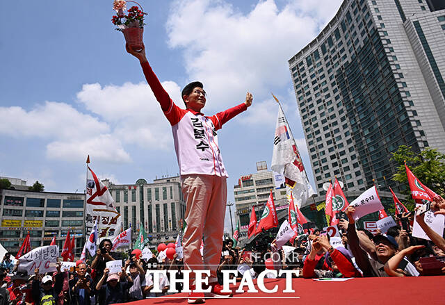 [더팩트ㅣ임영무 기자] 김문수 국민의힘 대통령 후보가 21일 오후 경기 고양시 화정역 문화광장 앞 유세에 참석해 지지자들을 향해 인사를 하고 있다. darkroom@tf.co.kr사진영상기획부 photo@tf.co.kr