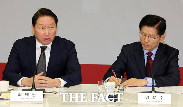 [더팩트ㅣ남윤호 기자] 최태원 대한상의 회장이 22일 오전 서울 중구 대한상공회의소에서 열린 '김문수 국민의힘 대선후보-경제5단체 간담회'에서 정책제언을 하고 있다.