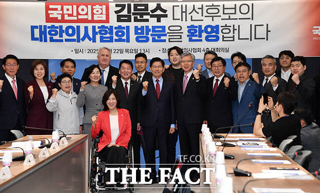 [더팩트ㅣ남윤호 기자] 김문수 국민의힘 대선후보(가운데)가 22일 오후 서울 용산구 대한의사협회를 방문해 김택우 의사협회장 등과 기념촬영 하고 있다.