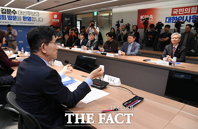 [더팩트ㅣ남윤호 기자] 김문수 국민의힘 대선후보(왼쪽)가 22일 오후 서울 용산구 대한의사협회에 열린 의협 회장단과 간담회에 참석해 모두발언 하고 있다.