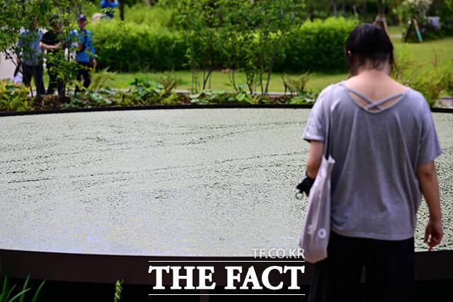2025 서울국제정원박람회을 찾은 시민들이 'Waterrooots!' 작품을 체험하고 있다.