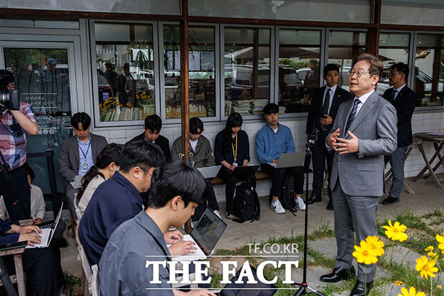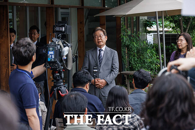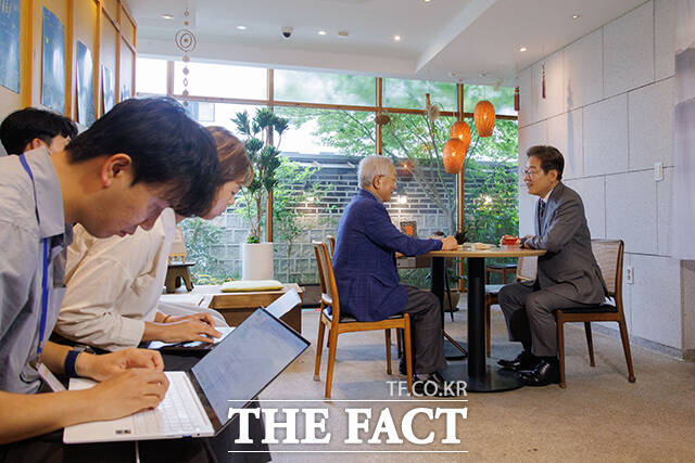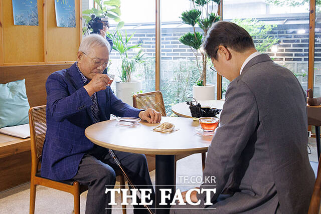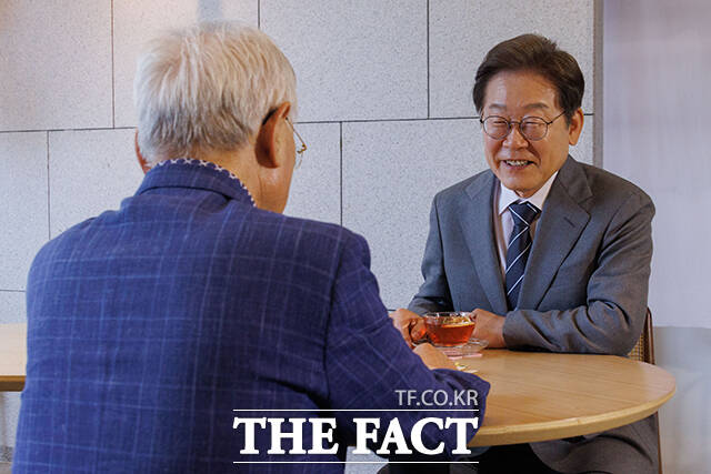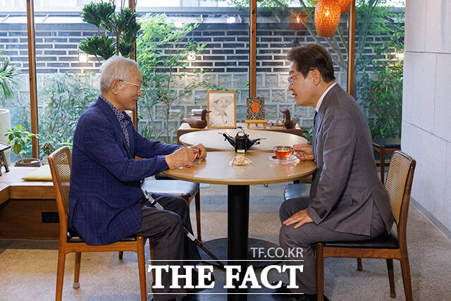 이재명 더불어민주당 대선 후보가 22일 오후 경남 양산시 소소서원에서 고 노무현 전 대통령의 정신적 멘토인 송기인 신부와 차담을 나누고 있다. /양산=배정한 기자