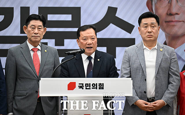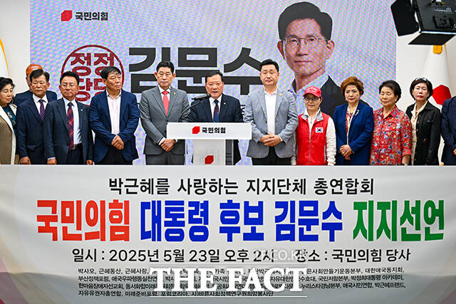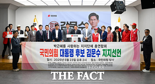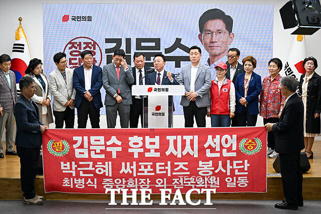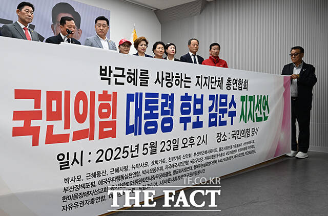 [더팩트ㅣ장윤석 기자] '박근혜를 사랑하는 사람들의 모임 총연합'이 23일 오후 서울 여의도 국민의힘 당사에서 긴급 기자회견을 열고 김문수 후보 지지 선언을 하고 있다.