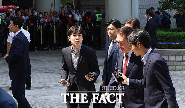 [더팩트ㅣ사진공동취재단] 26일 오전 서울 서초구 서울중앙지방법원에서 열린 내란 우두머리 혐의, 직권남용 권리행사방해 혐의 사건 5차 공판에 출석 중인 윤석열 전 대통령 뒤로 지지자들이 윤 전 대통령을 응원하고 있다.