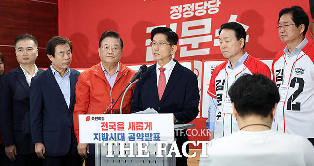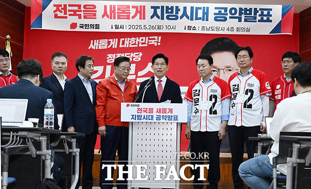 [더팩트ㅣ남윤호 기자] 김문수 국민의힘 대선후보가 26일 오전 충남 천안시 국민의힘 충남도당에서 '전국을 새롭게' 지방시대 공약을 발표하고 있다.