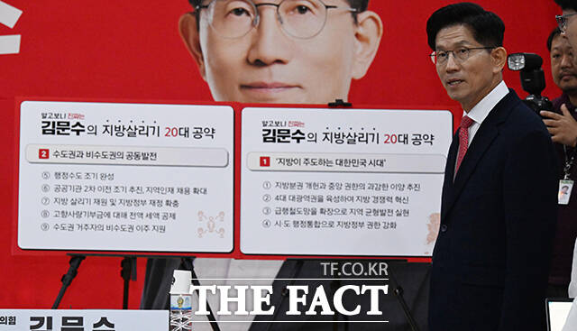 김문수 후보는 이날 충남 천안 국민의힘 충남도당에서 '지방이 주도하는 잘 사는 대한민국 실현을 위한 20개 공약'을 공개했다.