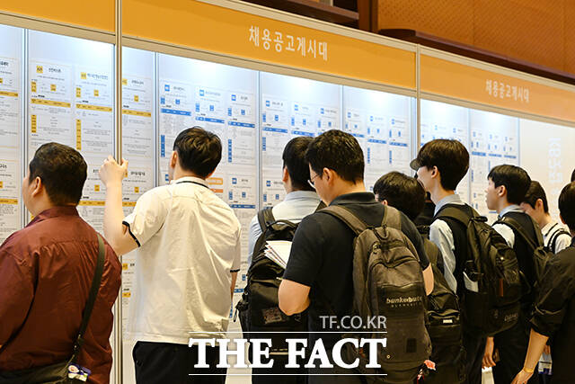[더팩트ㅣ서예원 기자] '2025 제1차 KB굿잡 우수기업 취업박람회'가 26일 오전 서울 강남구 코엑스 D홀에서 열린 가운데 구직자들이 채용공고 게시대를 보고 있다.