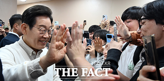 [더팩트ㅣ배정한 기자] 이재명 더불어민주당 대선 후보(왼쪽)가 25일 경기 수원시 아주대학교에서 열린 '아주대와 함께하는 대학생 간담회'를 마친 뒤 학생들과 하이파이브를 하고 있다.hany@tf.co.kr사진영상기획부 photo@tf.co.kr