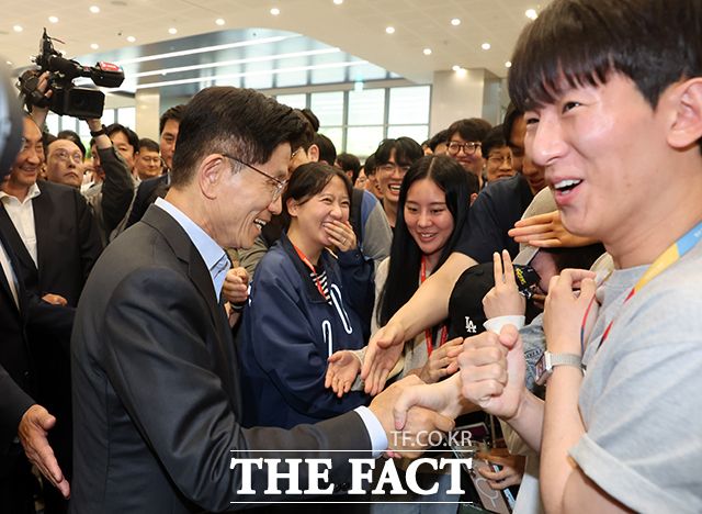 [더팩트ㅣ평택=남윤호 기자] 김문수 국민의힘 대통령선거 후보(왼쪽)가 26일 경기도 평택시 고덕동 삼성전자 반도체 공장을 찾아 직원들과 인사를 나누고 있다.