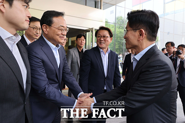 [더팩트ㅣ평택=남윤호 기자] 김문수 국민의힘 대통령선거 후보(오른쪽)가 26일 경기도 평택시 삼성전자 평택캠퍼스를 방문해 김완표 삼성글로벌리서치 사장과 인사를 나누고 있다. ilty012@tf.co.kr 사진영상기획부 photo@tf.co.kr