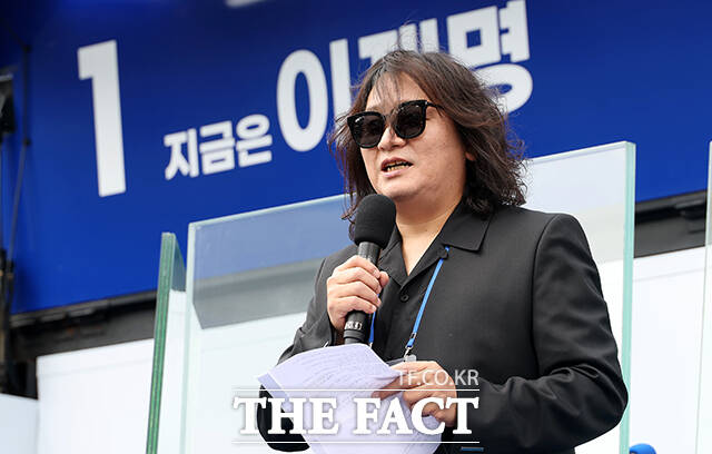[더팩트ㅣ용인=배정한 기자] 밴드 시나위의 기타리스트 신대철이 26일 오후 경기 용인시 단국대 죽전캠퍼스 앞에서 열린 이재명 더불어민주당 대선 후보의 유세에서 이 후보의 지지를 호소하고 있다.