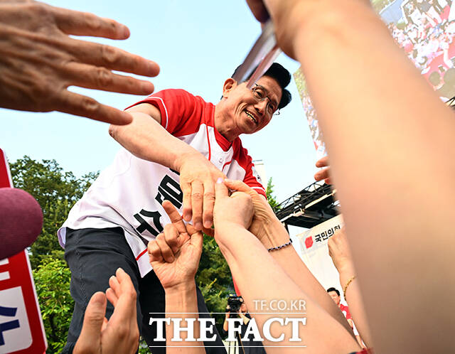 [더팩트ㅣ남윤호 기자] 김문수 국민의힘 대통령선거 후보가 26일 오후 서울 도봉구 방학사거리에서 열린 노원·도봉·강북 집중유세에서 지지자들에게 두 팔 벌려 인사하고 있다.