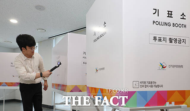 [더팩트ㅣ장윤석 기자] 제21대 대통령선거 사전투표를 하루 앞둔 28일 오전 서울 중구 신당누리센터에 마련된 사전투표소에서 선거관리위원회 관계자가 탐지기를 이용해 불법 촬영 카메라 점검을 하고 있다.j3321362@tf.co.kr사진영상기획부 photo@tf.co.kr