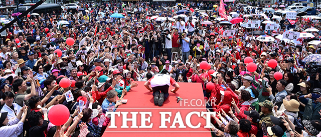 [더팩트ㅣ김해=남윤호 기자] 김문수 국민의힘 대통령선거 후보가 28일 오전 경남 김해시 수로왕릉공원에서 열린 유세에서 큰절을 하고 있다.