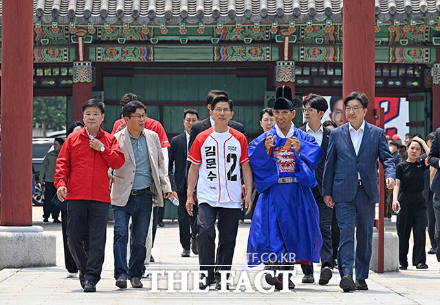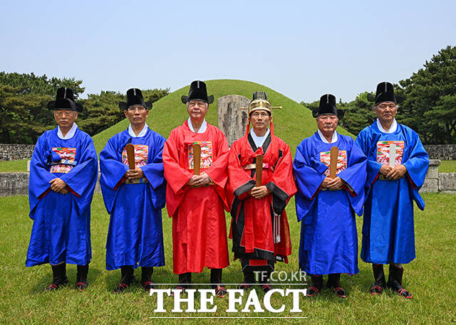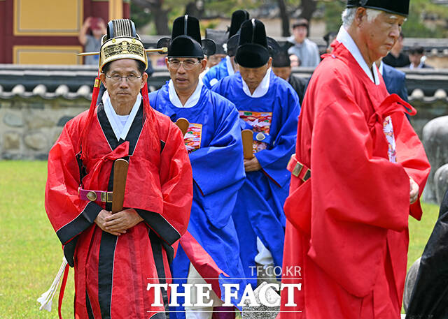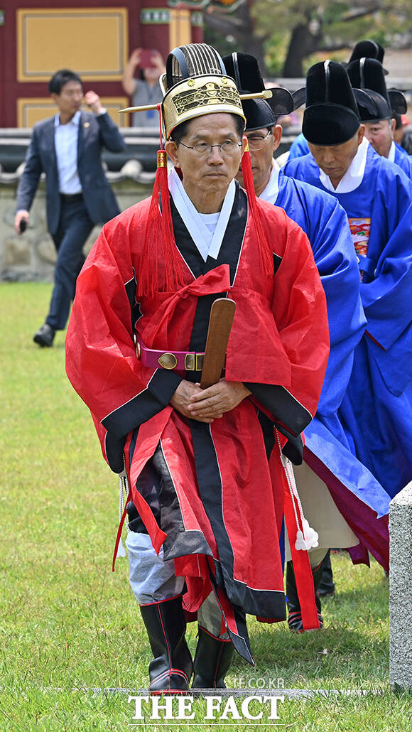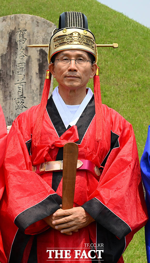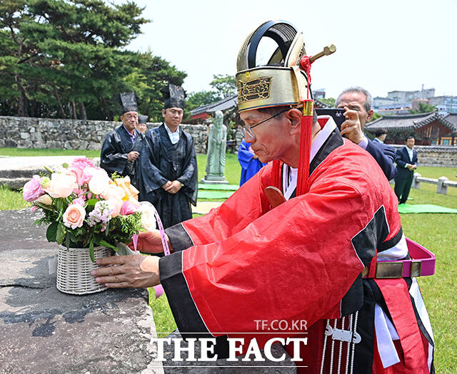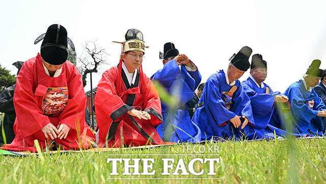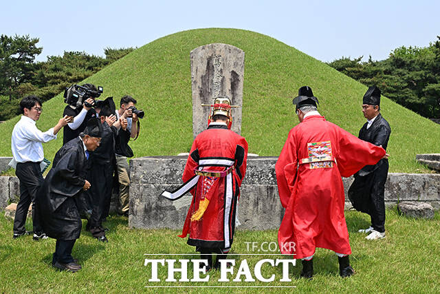 [더팩트ㅣ김해=남윤호 기자] 김문수 국민의힘 대통령 후보가 28일 경남 김해시 수로왕릉공원에서 열린 유세에 앞서 수로왕릉을 찾아 관복을 입고 헌화례를 하고 있다.