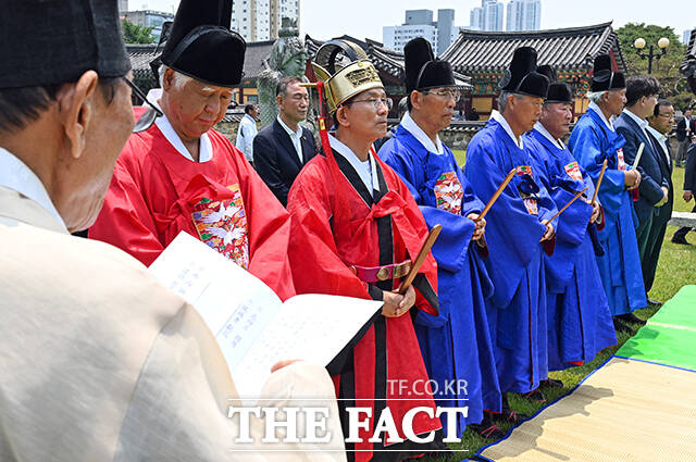 김문수 국민의힘 대통령선거 후보가 28일 경남 김해시 수로왕릉공원에서 열린 유세에 앞서 수로왕릉을 찾아 관복을 입고 헌화례를 하고 있다. /김해=남윤호 기자