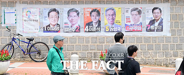 28일 오전 경남 김해시 수로왕릉 외벽에 붙은 제21대 대통령 선거 후보자 벽보에 8번 무소속 송진호 후보의 포스터가 보이지 않고 있다. /김해=남윤호 기자