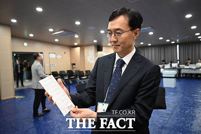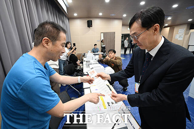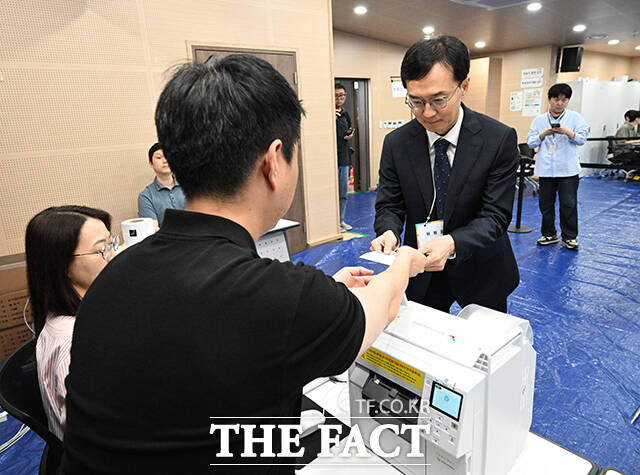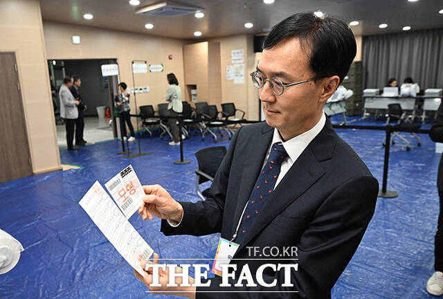 [더팩트ㅣ박헌우 기자] 오민석 서울시선거관리위원장이 28일 오후 서울 관악구 신사동 사전투표소에서 제21대 대통령선거 사전투표 모의체험을 하고 있다.