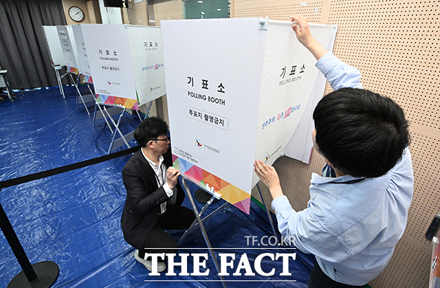 [더팩트ㅣ박헌우 기자] '제21대 대선' 사전투표를 하루 앞둔 28일 오후 서울 관악구 신사동 사전투표소에서 서울시선거관리위원회 관계자들이 기표소를 점검하고 있다.