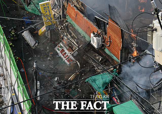 [더팩트ㅣ박헌우 기자] 28일 오후 서울 중구 을지로 세운상가 인근 한 건물에서 화재가 발생한 가운데 건물 구조물이 무너져 내리고 있다.
