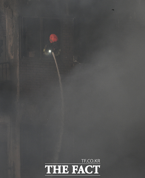 [더팩트ㅣ박헌우 기자] 28일 오후 서울 중구 을지로 세운상가 인근 건물에서 화재가 발생한 가운데 소방관이 진화 작업을 벌이고 있다.