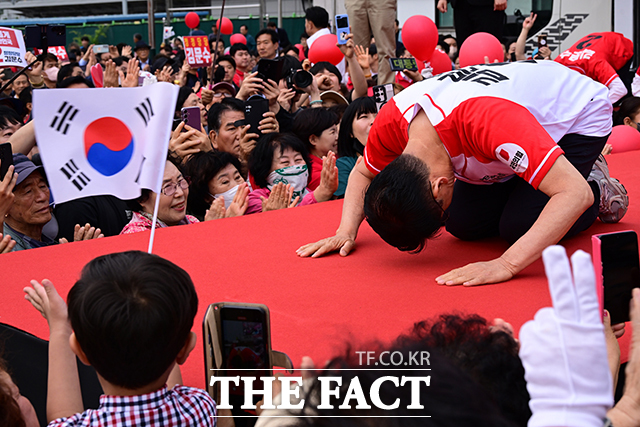 [더팩트ㅣ영천=남윤호 기자] 김문수 국민의힘 대통령선거 후보가 28일 오후 경북 영천시 영천역 광장에서 열린 유세에서 지지자들을 향해 큰절을 하고 있다.