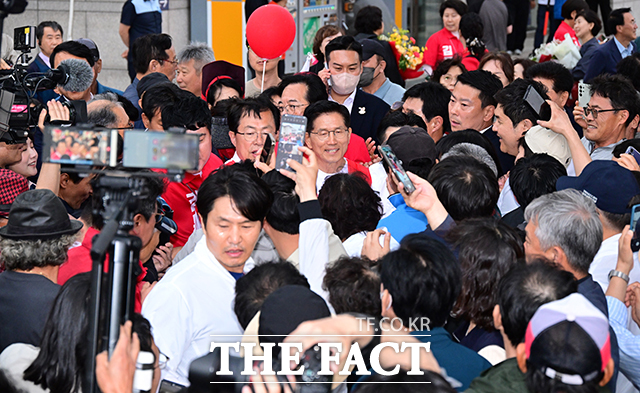 [더팩트ㅣ영천=남윤호 기자] 김문수 국민의힘 대통령선거 후보(가운데)가 28일 오후 경북 영천시 영천역 광장에서 유세를 마친 후 차량으로 이동하자 지지자들이 몰려 악수를 요청하고 있다. ilty012@tf.co.kr 사진영상기획부 photo@tf.co.kr
