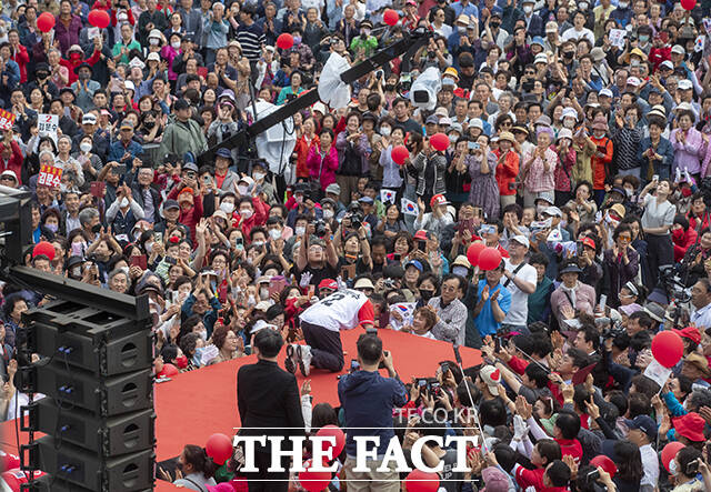 [더팩트ㅣ영천=남윤호 기자] 김문수 국민의힘 대통령선거 후보가 28일 고향인 경북 영천역을 방문해 별세한 어머니 이야기를 하며 눈시울을 붉히고 있다.