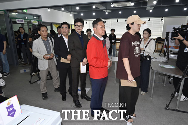 [더팩트ㅣ남윤호 기자] 한동훈 전 국민의힘 대표(왼쪽에서 두 번째)가 제21대 대통령선거 사전투표 첫날인 29일 오전 광주광역시 동구 창업지원센터 서남동사전투표소를 찾아 김정현 광주시당위원장, 김화진 전남도당위원장 등과 투표를 하고 있다.
