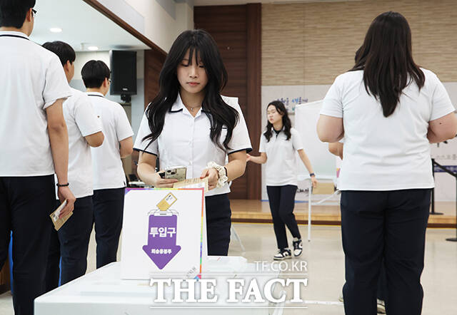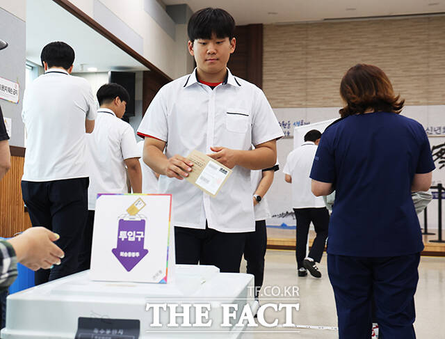 [더팩트ㅣ수원=임영무 기자] 제21대 대통령 선거 사전투표 첫날인 29일 오후 경기 수원시 장안구 연무동 행정복지센터에 마련된 사전투표소를 찾은 수원 삼일공업고등학교 학생들이 생애 첫 대선투표를 하고 있다.