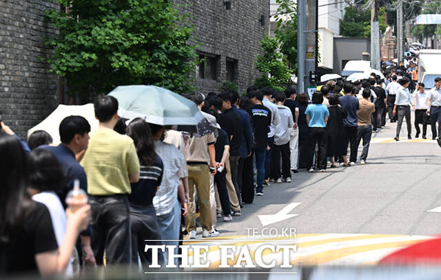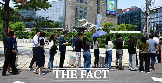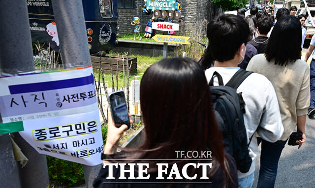 [더팩트ㅣ이새롬 기자] 제21대 대통령선거 사전투표 첫날인 29일 서울 종로구 사직동 주민센터에 마련된 사전투표소를 찾은 시민들이 투표를 하기 위해 줄지어 서 있다.