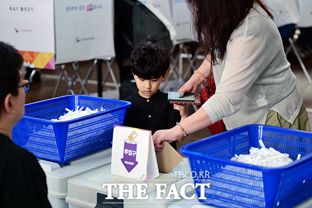 [더팩트ㅣ인천국제공항=남윤호 기자] 제21대 대통령선거 사전투표 첫 날인 29일 오후 인천국제공항 제1터미널에 마련된 사전투표소에서 부모를 따라나선 아이가 투표 장면을 바라보고 있다.