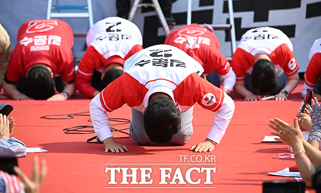 [더팩트|안산=박헌우 기자] 김문수 국민의힘 대선 후보가 제21대 대선 사전투표 첫날인 29일 오후 경기 안산시 안산문화광장에서 열린 유세에서 지지자들을 향해 큰절을 하고 있다.cjg05023@tf.co.kr사진영상기획부 photo@tf.co.kr