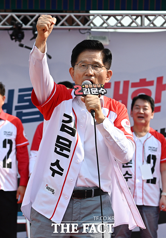 [더팩트|안산=박헌우 기자] 김문수 국민의힘 대선 후보가 제21대 대선 사전투표 첫날인 29일 오후 경기 안산시 안산문화광장에서 열린 유세에서 지지를 호소하고 있다.