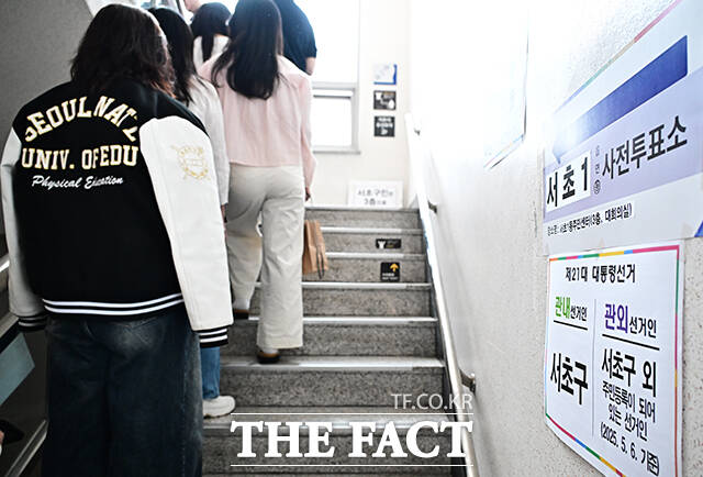 제21대 대통령선거 사전투표 둘째 날인 30일 오후 서울 서초구 서초1동 주민센터를 찾은 유권자들이 줄을 서서 투표 순서를 기다리고 있다. /배정한 기자