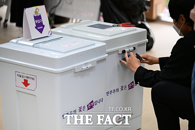 [더팩트ㅣ남윤호 기자] 제21대 대통령선거 사전투표가 마무리된 30일 오후 서울 중구 을지누리센터 사전투표소에서 관계자가 투표지 분류 작업을 위해 봉인지를 제거하고 있다.