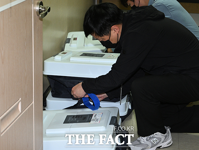 [더팩트ㅣ박헌우 기자] 제21대 대통령선거 사전투표가 종료된 30일 오후 선거관리위원회 관계자들이 서울시 중구 중구선거관리위원회로 이송된 투표함을 봉인하고 있다.