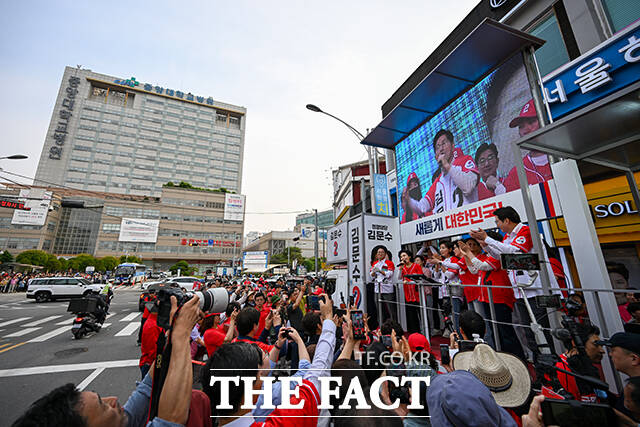 [더팩트ㅣ장윤석 기자] 김문수 국민의힘 대선 후보의 부인 설난영 여사를 비롯한 참석자들이 31일 오후 서울 동작구 중앙대학교병원 앞에서 지지를 호소하고 있다.j3321362@tf.co.kr사진영상기획부 photo@tf.co.kr