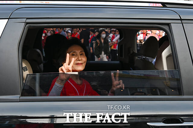 [더팩트ㅣ장윤석 기자] 김문수 국민의힘 대선 후보의 부인 설난영 여사가 31일 오후 서울 동작구 중앙대학교병원 앞에서 지지 유세를 마친 후 차량을 타고 이석하며 2번을 만들어보이고 있다.