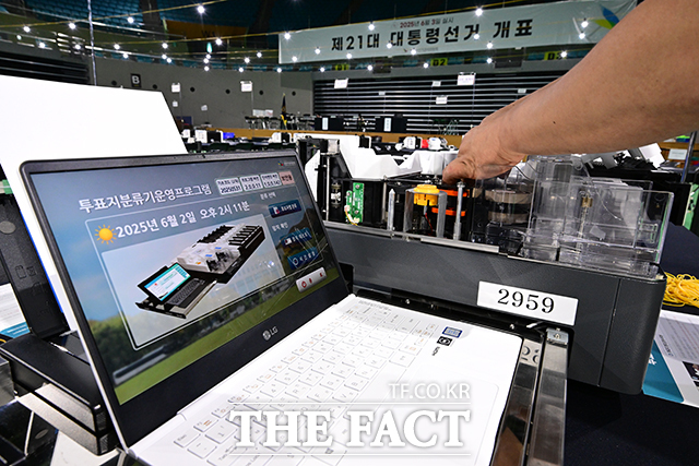 [더팩트ㅣ부평=남윤호 기자] 제21대 대통령선거가 하루 앞으로 다가온 2일 오후 인천 부평구 삼산월드체육관에서 관계자가 투표지분류기를 점검하고 있다.