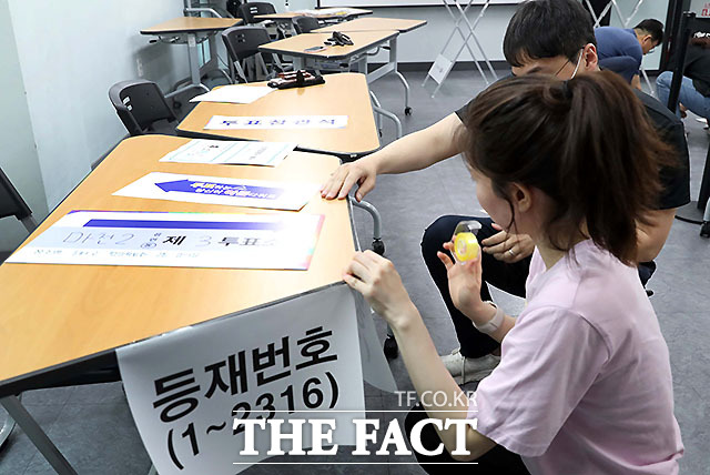더팩트ㅣ이효균 기자] 제21대 대통령선거를 하루 앞둔 2일 오후, 서울 송파구 마천동에 위치한 송파구 평생학습원에서 마천2동주민센터 직원들이 투표소를 설치하고 있다.