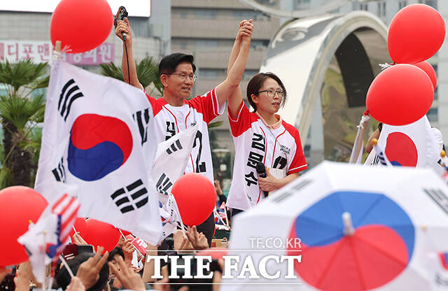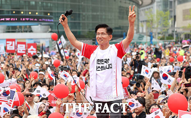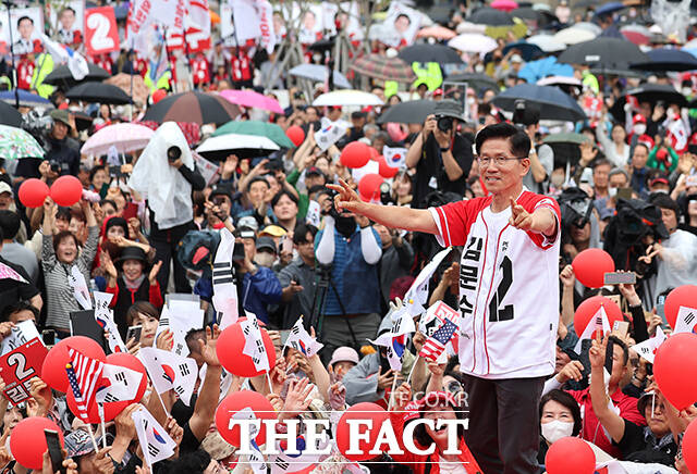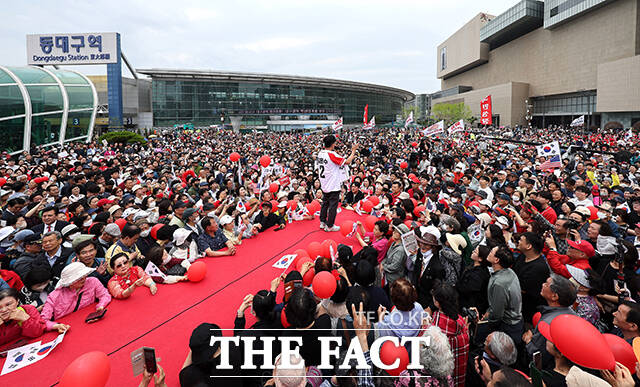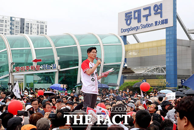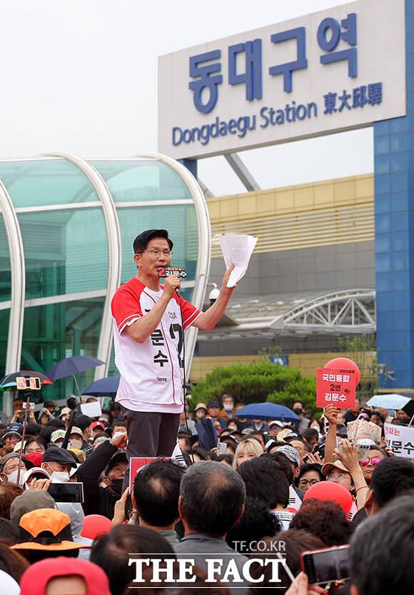 [더팩트ㅣ장윤석 기자] 김문수 국민의힘 대선 후보가 2일 오후 대구 동구 동대구역 광장에서 열린 집중유세에서 지지를 호소하고 있다.
