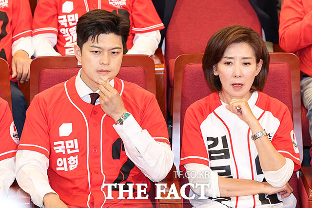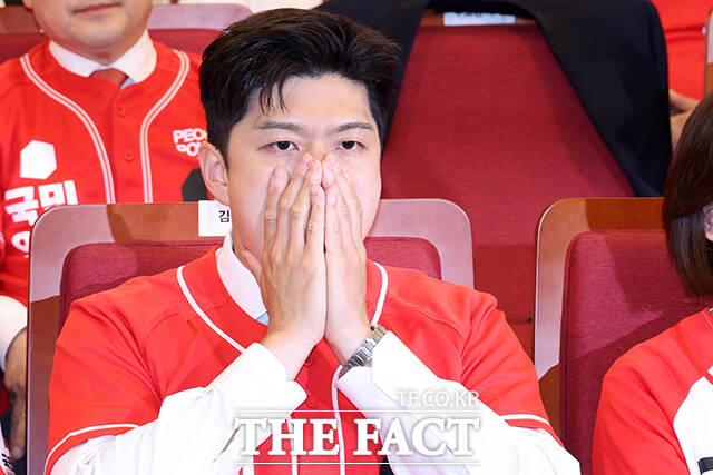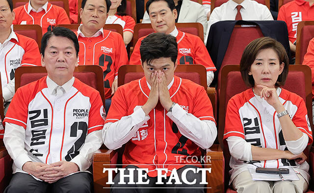 [더팩트ㅣ국회=박헌우 기자] 안철수 공동선대위원장(왼쪽)과 김용태 국민의힘 비상대책위원장이 3일 오후 서울 여의도 국회 도서관에 마련된 국민의힘 개표 상황실에서 제21대 대통령 선거 방송3사 출구조사 결과를 보며 굳은 표정을 짓고 있다.