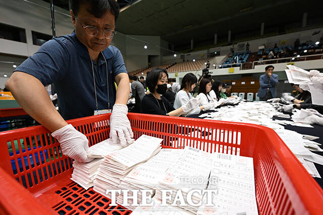 [더팩트ㅣ장윤석 기자] 제21대 대통령 선거일인 3일 오후 서울 관악구 서울대학교 체육관에 마련된 개표소에서 관계자들이 개표를 진행하고 있다.