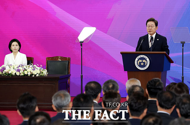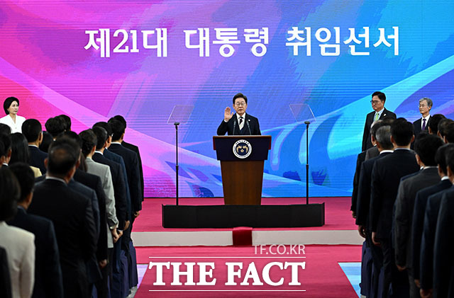 [더팩트ㅣ국회사진기자단] 이재명 대통령이 4일 오전 11시 서울 여의도 국회 로텐더홀에서 ‘취임선서’를 했다.